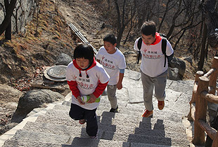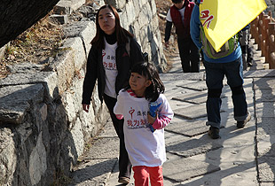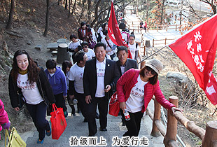 由于行進道路比較狹窄、坡度較大,大家三五成群,從慕田峪長城入口的中華夢石城出發(fā),沿著北步道,一路意志堅定,沿著幾里長陡峭的石階拾級而上,手拉著手歡呼雀躍地向著長城10號炮臺進發(fā)。在這條人流中,匯聚著綠之韻愛心經(jīng)銷商、公務(wù)員、知識分子、企業(yè)老板、務(wù)工人員、學生……他們彼此并不相識,博愛的名義卻把他們緊緊連在了一起。相識的、不相識的,大家揮舞慈善紅旗,以眼神鼓勁,用微笑問候,朝著一個共同的夢想、共同的愛心、共同的追求徒步前行。共沐大愛的心靈長河,誰人又不被感動呢?