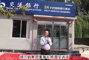 隨后,交通銀行領(lǐng)導(dǎo)向胡國(guó)安董事長(zhǎng)授“戰(zhàn)略合作”的牌匾。胡董在講話中強(qiáng)調(diào),本次的合作是一件利企利民、合作雙贏的好事。隨著綠之韻發(fā)展壯大和工業(yè)園經(jīng)濟(jì)發(fā)展的加速,綠之韻員工、經(jīng)銷商、工業(yè)園周邊群眾的存取款、匯款等基本業(yè)務(wù)的需求量較大,但營(yíng)業(yè)網(wǎng)點(diǎn)卻寥寥無幾,大家需要坐車到城里才能完成業(yè)務(wù)辦理,費(fèi)時(shí)費(fèi)力。這次綠之韻集團(tuán)總部交通銀行自助銀行的營(yíng)業(yè),將極大方便綠之韻人及周邊群眾的存取款業(yè)務(wù)辦理,衷心感謝交行領(lǐng)導(dǎo)的關(guān)心和支持。