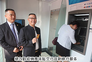 揭幕儀式后,綠之韻經(jīng)銷商代表張建軍、黃翔、沈慧芳等親身體驗(yàn)了交行自助銀行服務(wù);參與本次活動(dòng)的經(jīng)銷商、市民現(xiàn)場(chǎng)咨詢、辦理了相關(guān)銀行業(yè)務(wù)。