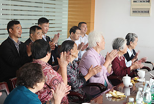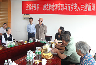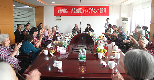 窗外的天空涼風(fēng)漸起,而窗內(nèi)的氣氛卻熱情洋溢,在綠之韻的3樓會議室里,“致敬老紅軍——綠之韻黨團(tuán)支部與百歲老人共迎重陽”的座談會正活躍而熱烈地進(jìn)行著。勞嘉副總裁首先作了摯情發(fā)言:“值此國慶前夕,重陽來臨之際,湖南省軍區(qū)東湖干休所的老紅軍、老干部,以及瞿所長、謝政委等各位軍官同志蒞臨綠之韻集團(tuán)參觀、指導(dǎo),是我們無上的榮耀,語言不足以表達(dá)我們無比激動、感動的心情,我謹(jǐn)代表綠之韻全體領(lǐng)導(dǎo)及員工,向在座各位老前輩們致以崇高的敬意,你們辛苦了!”并向大家介紹了綠之韻集團(tuán)所秉持的理念與精神,以及從2006年建設(shè)黨團(tuán)支部至今所開展的一系列慈善幫扶活動,得到了在座老前輩們的一致嘉許與肯定。