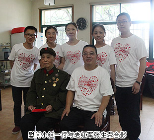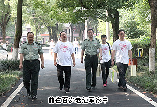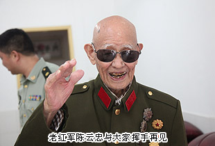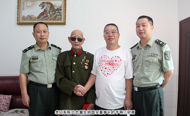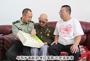 已逾百歲高齡的老紅軍陳云忠家中十分整潔,一面墻上醒目的掛著青年毛主席的肖像。談起革命往事,陳老記憶的閘門(mén)被打開(kāi),談起革命往事如數(shù)家珍。這位“飛奪瀘定橋”的幕后英雄,有一次夜行軍就磨破了一雙新鞋,他說(shuō)勝利就是一步步爭(zhēng)取得來(lái)的。可別看陳老身體好,他也受過(guò)傷痛的折磨,“大傷小傷都受過(guò),有一塊彈片在身體里呆了10多年?!?939年,陳老參加著名的黃土嶺戰(zhàn)役時(shí),敵人的一個(gè)小鋼炮打過(guò)來(lái),一塊彈片穿進(jìn)了他的右肩。由于醫(yī)療條件有限,陳老的肩膀當(dāng)時(shí)只進(jìn)行了一些簡(jiǎn)單的消炎處理,這塊彈片直到1951年才取出。當(dāng)大家詢問(wèn)起老人的身體時(shí),老人舉起手來(lái)十分自豪說(shuō):“我還能自己做飯呢?!倍吹胶鷩?guó)安董事長(zhǎng)送上的慰問(wèn)品和慰問(wèn)金后,老人頗有些羞澀,感觸的說(shuō):“謝謝你們對(duì)我的關(guān)心,我一切都好!”