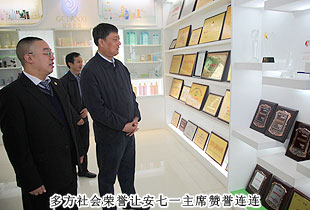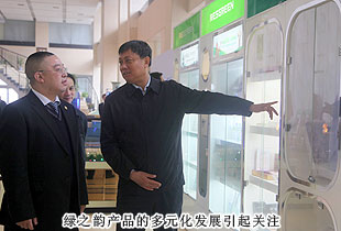 考察領導小組一行參觀了綠之韻集團總部基地及產(chǎn)品展示廳,“綠色、天然、環(huán)保、健康、養(yǎng)生”的產(chǎn)品研發(fā)理念,以產(chǎn)、學、研結(jié)合為模式組建的產(chǎn)品科研團隊都受到了安七一主席的充分肯定?!盀榱舜_保產(chǎn)品的品質(zhì),我們希望能夠更為全面的控制產(chǎn)品生物鏈上的所有環(huán)節(jié),包括原料、研發(fā)、生產(chǎn)和銷售,以打造綠之韻‘全產(chǎn)業(yè)鏈條’的產(chǎn)業(yè)結(jié)構。先后與南京大學、湖南農(nóng)業(yè)大學、湖南中醫(yī)藥大學等科研機構、院校展開戰(zhàn)略合作,全力打造‘產(chǎn)學研’成功合作典范。目前‘綠之韻’已被認定為高新技術企業(yè),我們擁有五大生產(chǎn)基地,其中益陽萬畝中藥材種植基地,為我們的保健食品提供了優(yōu)質(zhì)的產(chǎn)品原料”,綠之韻集團董事常務副總裁勞嘉向考察團一行匯報。