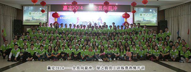 在這個節(jié)日氣氛尚未褪盡的初春時節(jié),為增強員工的團隊凝聚力,提高主動配合意識和協(xié)同能力,促使大家勇于挑戰(zhàn)自我,挖掘潛力,分秒必爭,達成目標(biāo),進一步積極、全面和深入地弘揚“厚德載物、目標(biāo)堅定、有容乃大、低調(diào)實干、勇往直前、厚積薄發(fā)、團隊制勝、堅持到底、整合資源、改變自我”的綠之韻“水文化”,綠之韻集團組織全體員工進行了為期三天兩晚的“贏定2014——全員向前沖”訓(xùn)練營活動。