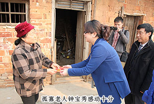 最后,慰問小組來到的是兩位孤寡老人家,他們分別是69歲的鐘寶秀和70多歲的老黨員黃軍輝。鐘寶秀老人,本是四口之家,奈何因家族性精神病史,丈夫與兩個(gè)兒子先后離世,讓她從此孤苦無依。黃軍輝老人則是一位老共產(chǎn)黨員,曾經(jīng)還是荷花片婦女主任,如今年年被評(píng)為村里的先進(jìn)分子。老人精神很好,向慰問組組員們一一道謝,還直言道:“你們又送錢又送東西,卻茶都不喝一口,這叫我怎么好意思!”