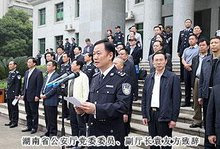 啟動儀式上,湖南省公安廳黨委委員、副廳長袁友方致辭:省委、省政府高度重視“規(guī)范執(zhí)法警營開放周”活動,要求各市州縣公安機(jī)關(guān)加強(qiáng)組織領(lǐng)導(dǎo),“一把手“要親自部署、親自抓落實,做到分工明確,責(zé)任到位,要做到全警參與;加強(qiáng)協(xié)調(diào)配合,統(tǒng)籌規(guī)劃,突出特色和亮點;要加大宣傳,擴(kuò)大社會影響,利用各種新聞媒體加強(qiáng)宣傳、報道,擴(kuò)大活動的社會影響,營造良好的社會輿論氛圍。