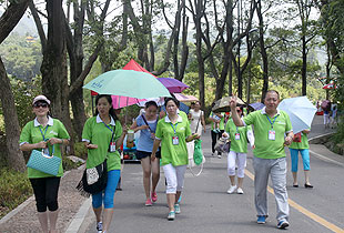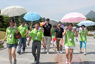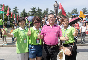 上午10時,綠之韻營銷精英2013韶山紅色之旅一行抵達(dá)了魂牽夢繞的美麗韶山。第一站,來到毛澤東銅像廣場,瞻仰偉大的毛主席。毛主席銅像立于高高的紅色花崗巖石基座上,背靠韶峰,主席身軀偉岸,手握書卷,雙眼炯炯有神,面帶微笑地注視著廣場,注視著遠(yuǎn)方,仿佛在歡迎遠(yuǎn)來的客人和世界各地的朋友,主席又似乎停步思考著天下的大事,一派學(xué)者風(fēng)范。胡國安董事長不畏炎熱,百忙之中驅(qū)車來到偉人故里,來到綠之韻伙伴們身邊,追憶往昔,敘說衷腸,暢享夢想,伙伴們興奮不已、激情四溢,整齊有序排好隊列和胡國安董事長一一合影留念。接著,在胡國安董事長的引領(lǐng)下,大家懷著無比崇敬的心情向毛主席的銅像獻(xiàn)花、敬禮,向毛主席三鞠躬,像全國各地奔向韶山?jīng)_的人們一樣,通過這種最傳統(tǒng)的方式來祝福、紀(jì)念、緬懷……站在巨大的塑像腳下,一種自豪而激動地情懷油然而生,綠之韻們伙伴們不禁讓我想起毛主席那豪邁飄逸的詩篇《沁園春?雪》:“數(shù)風(fēng)流人物,還看今朝”。