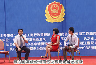 湖南省打擊傳銷工作聯(lián)席會議辦公室主任、湖南省工商局副局長魯先華,湖南省打擊傳銷工作聯(lián)席會議辦公室副主任、湖南省經(jīng)濟(jì)檢查總隊(duì)總隊(duì)長毛愛倫,湖南省經(jīng)濟(jì)檢查總隊(duì)副總隊(duì)長肖向陽,長沙市工商局黨組書記、局長卓精華,長沙市工商局黨組副書記、副局長潘虹,長沙縣人民政府副縣長、公安局長曾衛(wèi)國,長沙縣工商局黨組書記、局長舒曲等領(lǐng)導(dǎo)和嘉賓蒞臨活動現(xiàn)場指導(dǎo)。綠之韻集團(tuán)受邀參與此次活動,湖南分公司代表、高級經(jīng)銷商蘇龍輝先后與主持人、居民朋友進(jìn)行一問一答式互動,贏得了現(xiàn)場陣陣熱烈的掌聲。