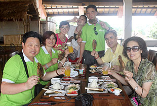烏布皇宮是烏布王朝在16世紀(jì)所建造的皇宮,遺址內(nèi)雖已無國(guó)王居住,但據(jù)說還有其皇族后裔深居其中,皇宮外觀雄偉的石刻技術(shù)堪稱一絕,內(nèi)部裝潢更是金碧輝煌令人贊嘆不已。在烏布,手工作坊和賣藝術(shù)品的小店隨處可見,但來烏布最不能錯(cuò)過的還是烏布傳統(tǒng)市場(chǎng),這幾乎是每一位巴厘島觀光客旅行中不可錯(cuò)過的旅游地點(diǎn),綠之韻精英們?cè)缇湍θ琳?、躍躍欲試,蜂擁而上選購(gòu)自己心儀的手工藝品和商品。烏布傳統(tǒng)市場(chǎng)位于烏布市中心,烏布皇宮正對(duì)面,除了一排灰白的兩層式建筑,周圍的三條路上還聚集了各式的商店,這里是烏布的精華區(qū),人多嘈雜,各式貨品都有,例如銀器、木雕、編織、各式蔬果、衣服、沙龍、皮件、鞋子及紀(jì)念品、樂器等等。午餐時(shí),綠之韻精英們大飽口福,享用了印度尼西亞獨(dú)特的臟鴨餐,巴厘島的特色美食臟鴨餐是赫赫有名的特色餐品。當(dāng)?shù)鼐用癜养喿由B(yǎng)在稻田中,非常的生態(tài),由于鴨子靠吃食稻田里的小蟲為生,當(dāng)?shù)厝朔Q臟鴨。鴨肉鮮美,富有彈性,極少的脂肪,在當(dāng)?shù)靥赜械呐腼兗庸ず螅成咸刂漆u料,大家紛紛感嘆美味夠勁道,真是聞名不如品嘗。